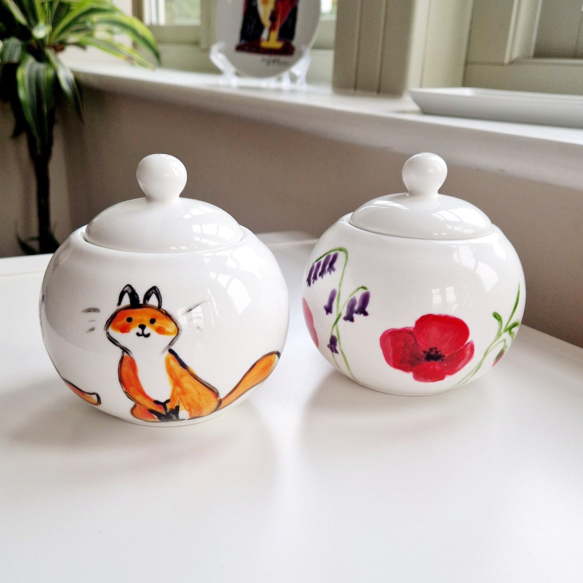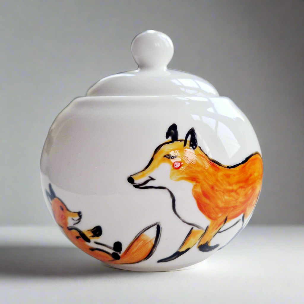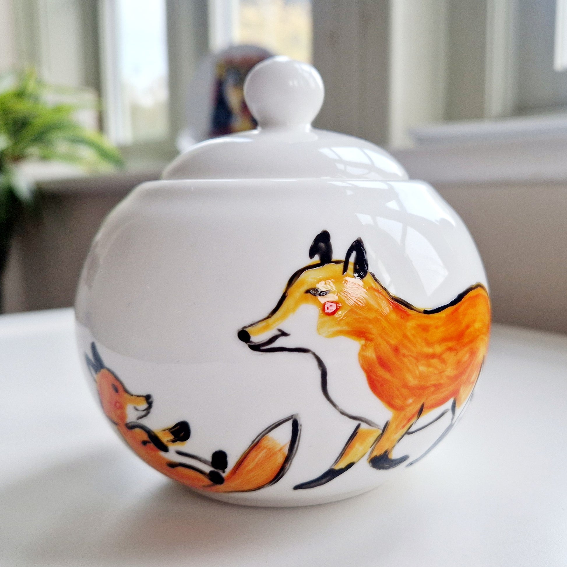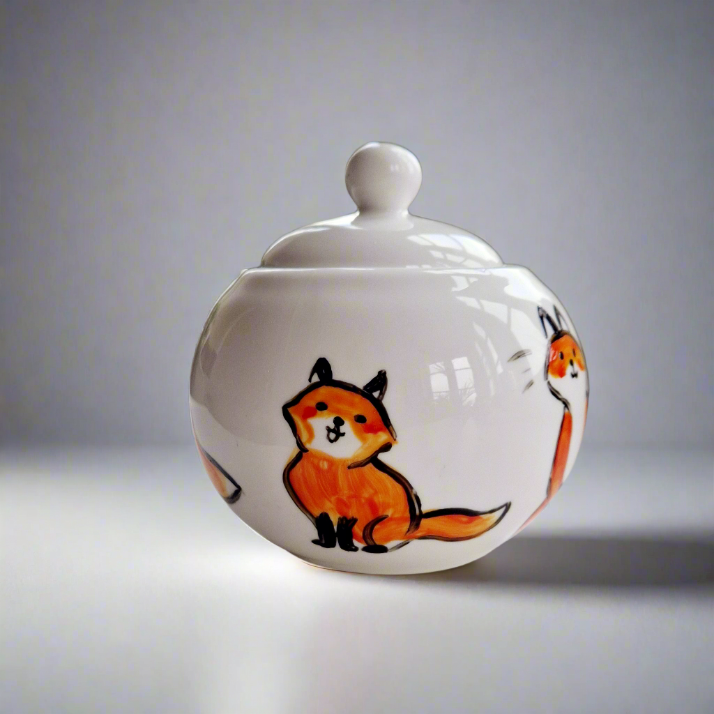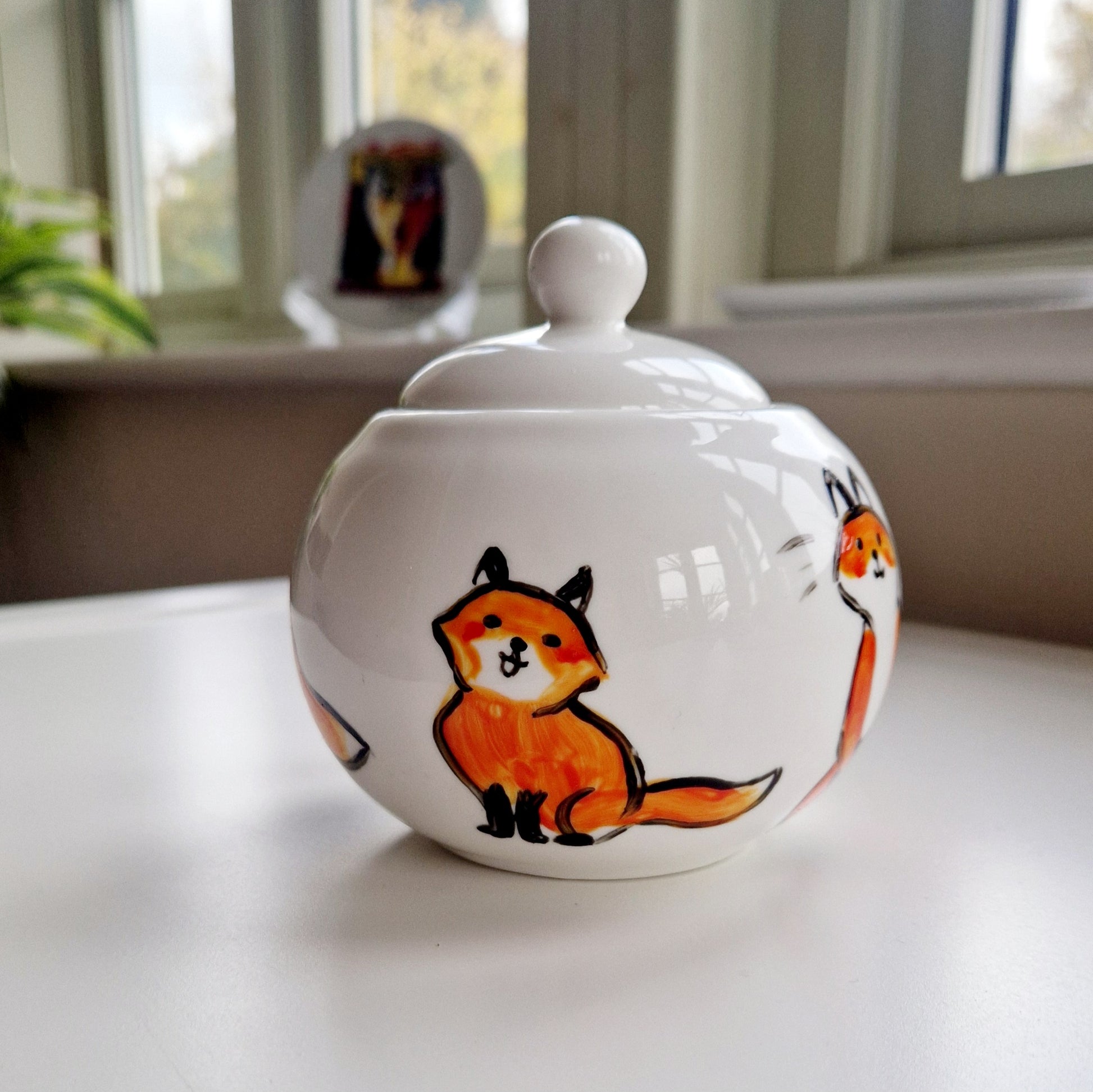 Cute Foxes Hand Painted on ceramic sugar pot, then heat cured to make it microwave and dishwasher-safe. If hand-washed, I recommend not using abrasive materials to wash this special piece.