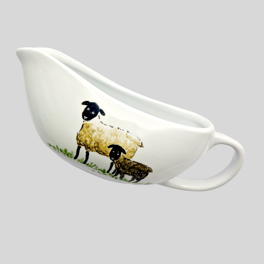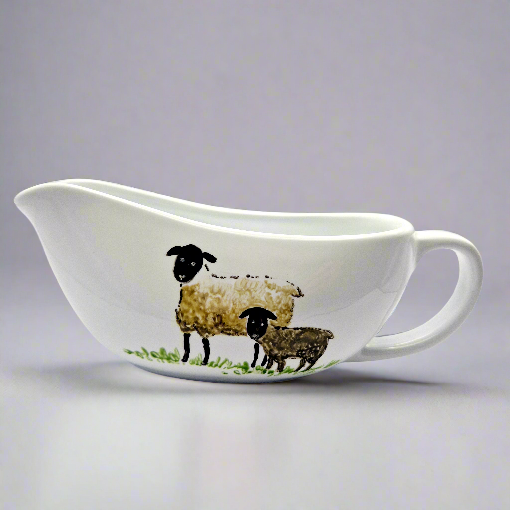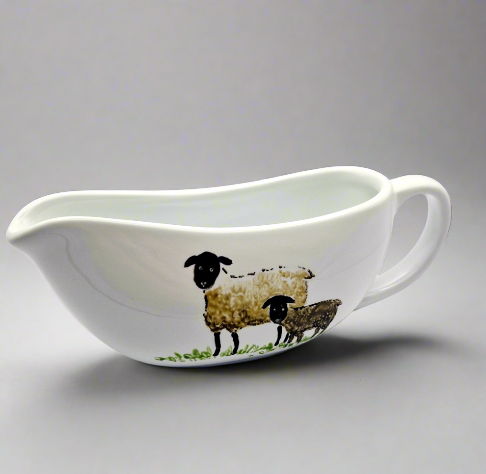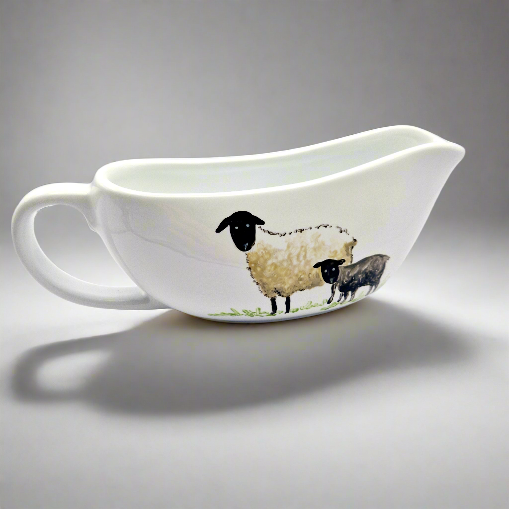 Sheep Hand Painted on ceramic gravy boat, then heat cured to make it microwave and dishwasher-safe.