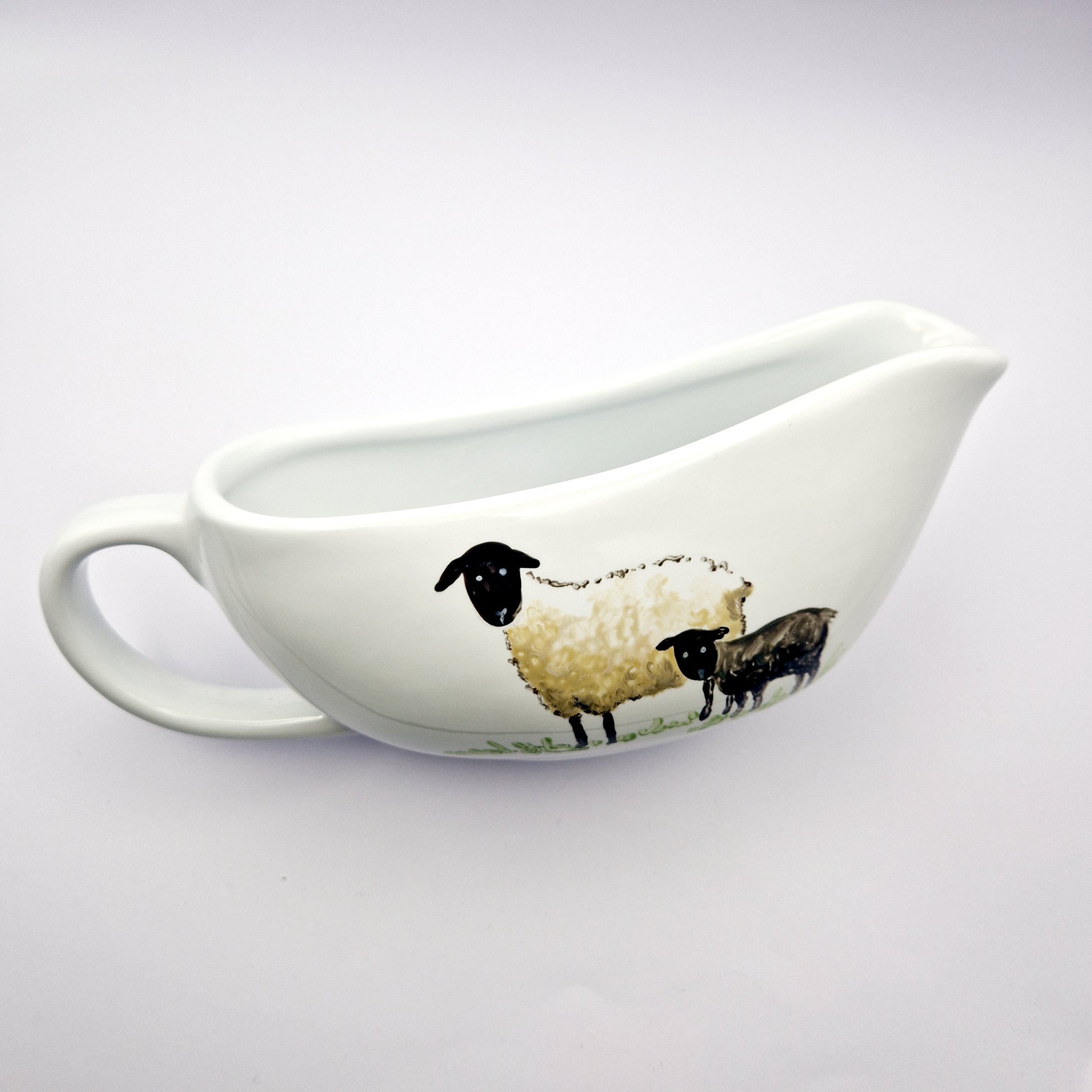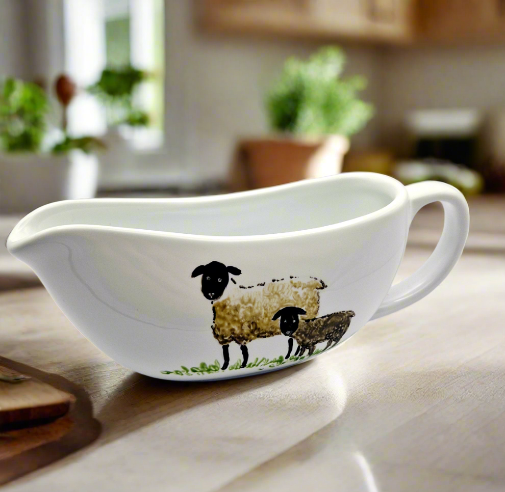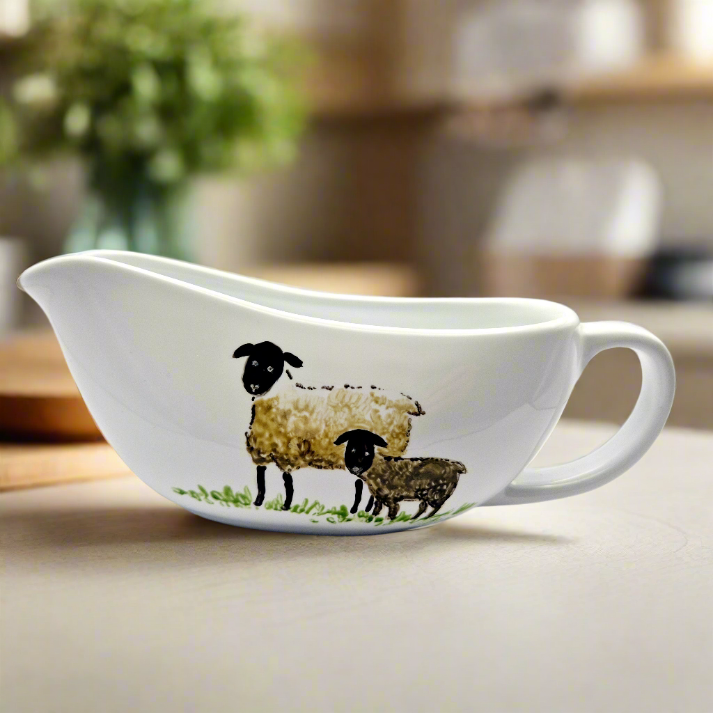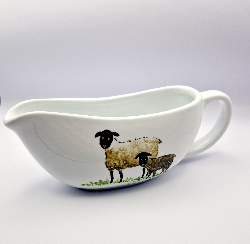 Sheep Hand Painted on ceramic gravy boat, then heat cured to make it microwave and dishwasher-safe.