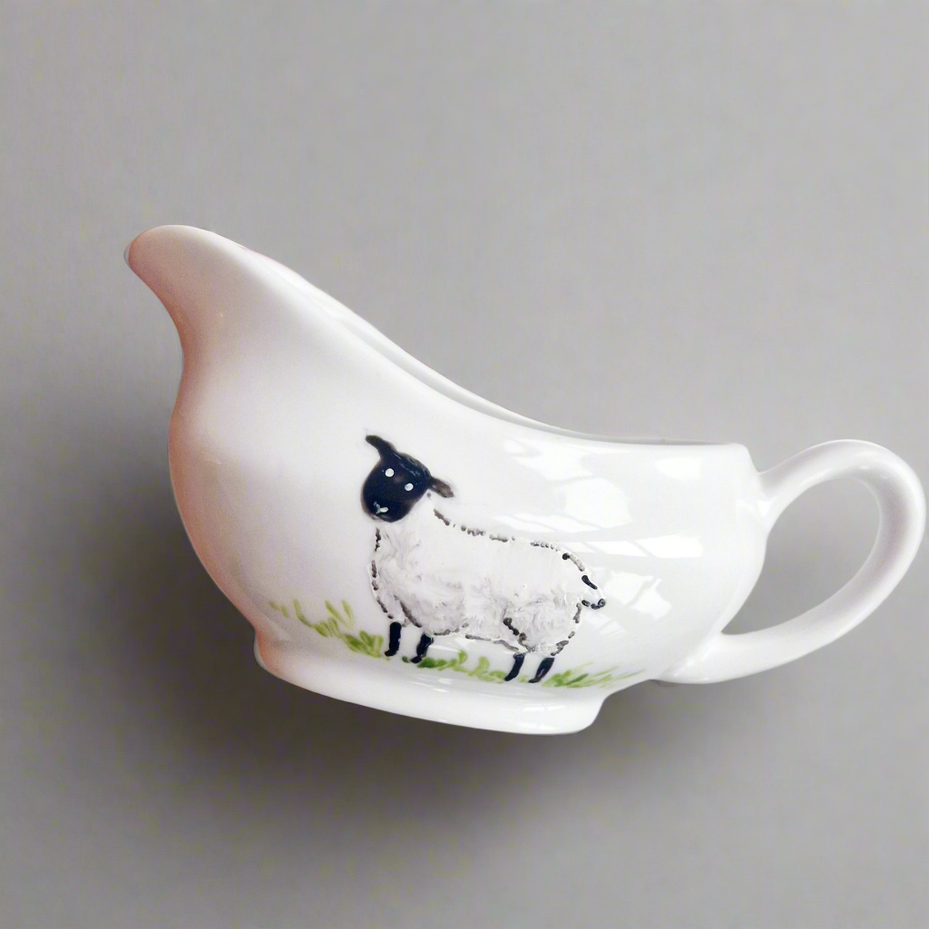 Sheep Hand Painted on ceramic gravy boat, then heat cured to make it microwave and dishwasher-safe.